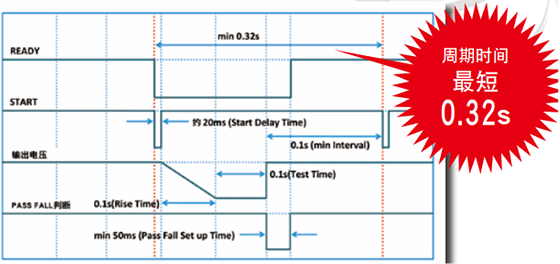 与TOS5050A(Min测试时间0.5s)比较时,测试时间快5倍,实现工作时间缩短。工作时间的缩短直接提高生产率,许多客户都要求对测试时间的Min设定值进行变更/改造。但是,比测定的响应速度还要快的试验时间会极端地影响测量精度,这是耐压测试中非常重要的问题。